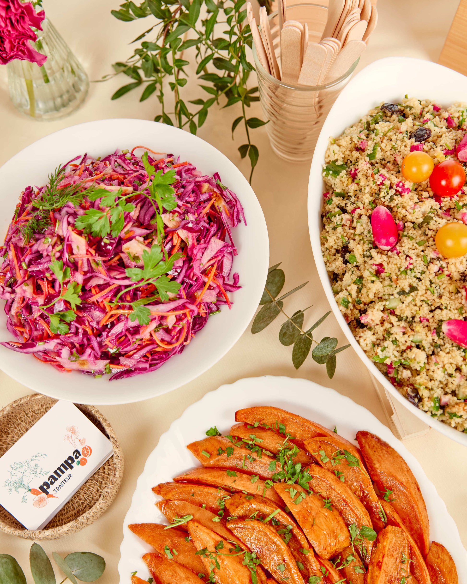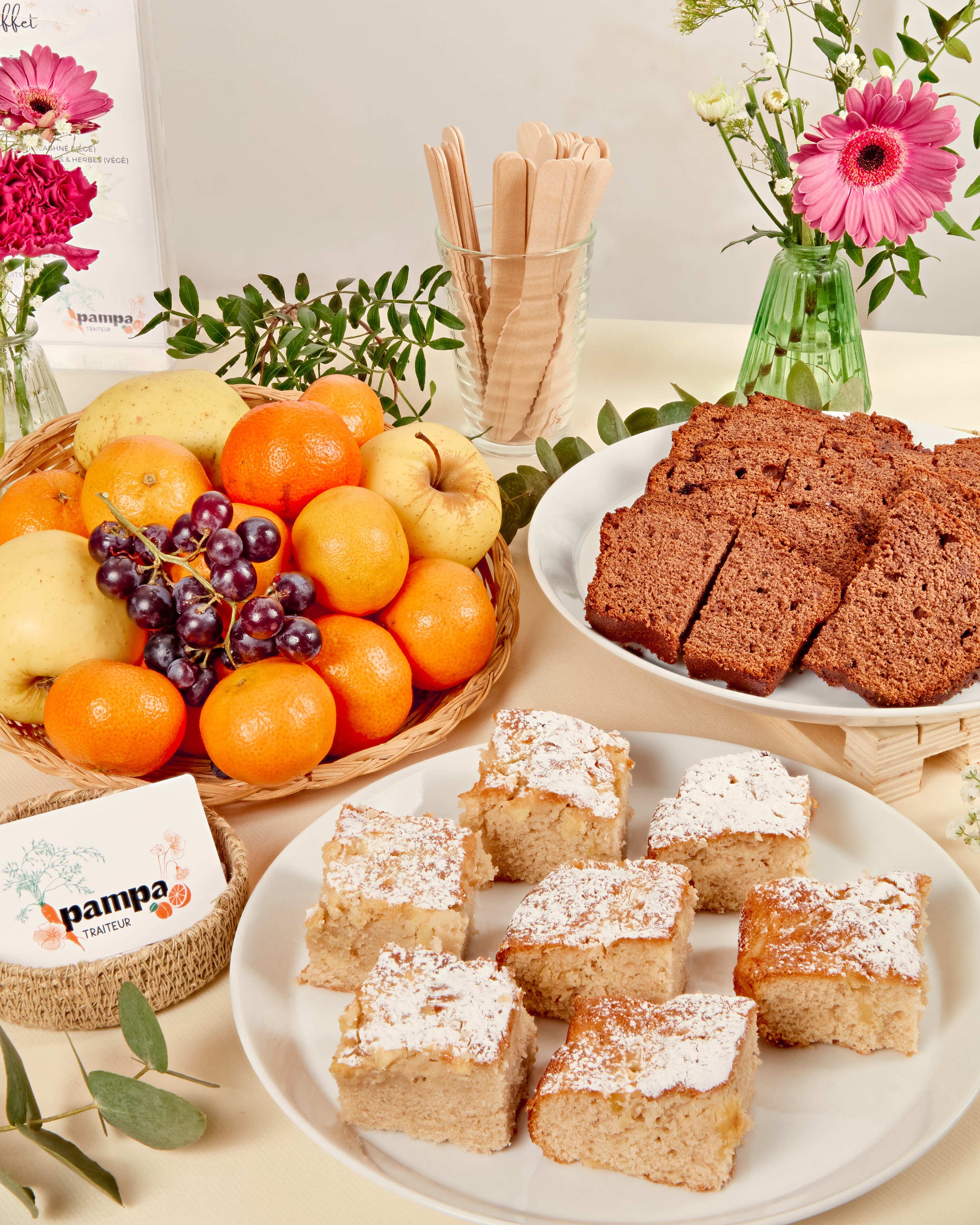 Ainsi que toute le matériel nécessaire : gobelets, serviettes, assiettes, couverts et nappe. Une décoration florale simple accompagne chaque formule.
